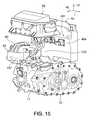 FIG. 15 is a front, left side perspective view of the arrangement of the main constituent features in the motor room of the electric vehicle component mounting arrangement in accordance with the first embodiment.