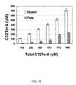 FIG. 17: This figure is a Scatchard plot showing the binding of C12TerA to polymeric carrier containing a hydrophobic group disclosed in U.S. patent application Ser. No. 11/613,183, which is hereby incorporated by reference. The carrier also referred to as PGC-HC18 or 20PLPEG555-C18 is made up of polylysine of 15-30 kDa where 55% of the amino group is covalently modified to contain 5 kDa methoxypolyethylene glycol attached by through succinate linker and the remaining 45% of the amino group is amide bonded to stearic acid carboxyl group all disclosed in U.S. patent application Ser. No. 11/613,183. Two hundred fifty μl solutions of carrier (2.5 mg/tube) were mixed with 0.20, 0.15, 0.10, 0.075, 0.050, and 0.025 mg of C12TerA. Sample was made up to 150 μl PBS and incubated overnight. The bound from 75 μl was eluted from Bio-spin-P30. The void volume containing loaded carrier was unloaded by filtration through 100 kDa MWCO filter after addition of 75 μl acetonitrile, to release load. The filtrate containing bound C12TerA was quantified by HPLC. A controlled passed through the same filter in 50% acetonitrile was used as a reference for the total C12TerA in each tube, allowing for the calculation of Free C12TerA in the original incubation mixture. C12-TerA elutes at 2.4 minutes. A gradient of 25-99% acetonitrile from 1-6 minutes at a flow rate of 1.5 ml/min was used. The column wasMercury MS 20×4 mm; 2 um; C12 from Phenomenex. Although the Scatchard plot is not completely linear, an average Kd of 1-5 μM can be estimated, indicating a strong interaction of C12TerA with the carrier containing the hydrophobic group, which is sufficient to prolong the biological half-life of the C12TerA and delay its rapid activation and degradation. It should be noted that some C12TerA can form micelle and may be counted as bound due to the analytical techniques used.