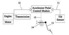 As shown inFIG. 1, which is a functional block diagram of a vehicle including a preferred embodiment of an anti-rollback control system in accordance with the present invention, the powertrain of the vehicle in which the anti-rollback control system is used includes an ICE (Engine) and/or an electric motor (Motor), and an automatic transmission (Transmission). In this embodiment, the anti-rollback control system comprises: a Tilt Sensor; a sensor that detects the selected operating mode of the transmission system (not shown in the drawing for simplicity); an operator-independent accelerator pedal (13) position-adjusting device (14); and an Accelerator Pedal Control Module.