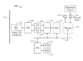 FIG. 2 shows an example of aPLC modem200 constructed in accordance with the present invention. ThePLC modem200 includes an analog electromagnetic field transducer210 (e.g., one or more pickup coils or antennas) that detects electromagnetic fields from the PLC network212 on which data is impressed and converts them into output signals that are processed by the remaining components of the PLC modem. For simplicity of illustration only, a single pickup coil is shown inFIG. 2. Of course, as previously mentioned, in some cases separate antennas may be provided for reception and transmission purposes. Thetransducer210 also includes anelectronics housing205 that includes the various signal processing components such as A/D and D/A converters, which are discussed in more detail below. As further shown inFIG. 2, thePLC modem200 also includes adevice interface215 such as an Ethernet port, USP port, an RJ-11 connector, an RS-232 connector, a USB connector, a 10/100 Base-T connector, an RJ-45 connector, or the like to connect anetworked device220 to thewireless PLC modem200.