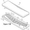 In assemblingtensile strand element130,second layer132 is initially placed uponpin plate142, as depicted inFIGS. 13A and 14A. When properly positioned, pins144 protrude throughsecond layer132 in various locations at the periphery ofsecond layer132. Oncesecond layer132 is positioned, one of securingelements133 is placed uponsecond layer132, as depicted inFIGS. 13B and 14B, such thatpins144 protrude therethrough. At this stage, the strand formingstrand segments114 is wound around some ofpins144, as depicted inFIGS. 13C and 14C, to begin the process of locatingstrand segments144 relative tosecond layer132 and securingelement133. The strand is then wound around a remainder ofpins144, as depicted inFIGS. 13D and 14D, to complete the positioning ofstrand segments114. Oncestrand segments114 are properly positioned, the other of securingelements133 is placed overstrand segments114, as depicted inFIGS. 13E and 14E, andfirst layer131 is positioned, as depicted inFIGS. 13F and 14F.