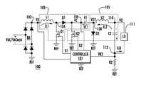 FIG. 4 is a timing diagram showing exemplary operating waveforms over one period of VAC without dimming. As shown, the signals VAC, IL1, G1, VC1, IL2, ILD and G2 are plotted versus time for a full cycle of VAC. VAC and IL1 are normalized and superimposed, and IL2 and ILD are again superimposed. In the illustrated configuration, theboost converter103 is operated in discontinuous current mode with “constant” on-time (periodically adjusted). The peak current in the inductor L1 follows the envelope of the rectified AC voltage VR. The resulting power factor and line current harmonic content meet regulatory requirements. The energy delivered by theboost converter103 varies as a function of the rectified AC voltage VR as shown by the variation of the voltage VC1. Thecontroller101 adjusts the duty cycle of thebuck converter105 in response to application of VC1 and thus collectively regulates the load current ILD. In one embodiment, the peak current level (IPK) of IL2 is predetermined and constant, so that the duty cycle of G2 (and thus Q2) varies with variation of VC1. This minimizes the line frequency flicker and the energy storage.