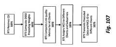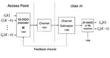 CSI Feedback: The DIDO clients feedback the CSI wirelessly to the DIDO distributed antennas. If TDMA, FDMA or CDMA schemes are used for feedback, only one DIDO distributed antenna (the one with best SNR to all users) is selected to receive the CSI. If MIMO techniques are employed, all DIDO distributed antennas are used simultaneously to demodulate the CSI from all clients. Then the CSI is fed back from the DIDO distributed antennas to theDIDO BTS6112 via theDIDO BSN6111. Alternatively, the CSI can be fed back wirelessly directly from the clients (or the DIDO distributed antennas) to aDIDO BTS6112 equipped with one antenna via TDMA or CDMA schemes. This second solution has the advantage of avoiding latency caused by theDIDO BSN6111, but may not be achievable if the wireless link between each of the clients (or the DIDO distributed antennas) and theDIDO BTS6112 is not of high enough SNR and reliability. To reduce the throughput requirement over the UL channel, the CSI may be quantized or any number of limited feedback algorithms known in the art can be applied [28-30].