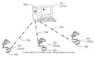 In many embodiments, the term “proximity” indicates those sharedaudio devices101 are sufficiently close to operably couple with each other and/or other devices within the sharing region, such as to establish acommunication link104. In certain embodiments, a wireless link can provide the geographic proximity that allows data transfer of the shared audio, or portions thereof. In certain embodiments, the communication link that can transfer shared audio and/or audio information can include a direct-vocal link such as an individual talking directly to another person (e.g., a teacher speaking to a class, a presenter talking to individuals in a small building, or a singer or announcer in a small auditorium or venue singing or talking to an audience or sporting-event attendees.