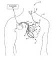 In some examples, delivery of electrical stimulation to a tissue site proximate a nerve or a nonmyocardial tissue site that may not be proximate a nerve may help modulate an autonomic nervous system ofpatient12. In some examples,INS26 may deliver electrical stimulation therapy to a nerve ofpatient12 via a lead implanted within vasculature (e.g., a blood vessel) ofpatient12. In some examples,INS26 may deliver electrical stimulation that is delivered to peripheral nerves that innervateheart14, or fat pads onheart14 that may contain nerve bundles. The fat pads may be referred to as a nonvascular cardiac tissue site.