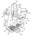 Theapparatus10 of the present invention also includes a number ofsensors28 that are attached the individual14 that is being trained and optionally at various locations on theapparatus10 itself. For example,inertial sensors28, which are well known in the art, can be placed on various parts of the body of the individual14 to sense position and velocity. An example of a prior artinertial sensor28 is shown inFIG. 5 withcircuit board29 andelectrical lead31. As a further example, aninertial sensor28 can be positioned on the trunk of the individual14 to sense trunk angle and velocity, which are important factors to be studied in connection with fall prevention training. Whilesensors28 are preferred, other ways to measure body location can be used, such as video analysis of body movement.