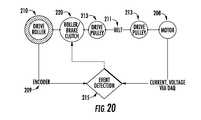 In one embodiment of the present invention, referring toFIGS. 15A,15B and15C and representationally shown inFIG. 20, a novel roller/brakeclutch system220, alternatively referred to as a slip clutch system, such as a electromagnetic (EM) or magnetorheological (MR) roller/brake clutch, connected betweendrive pulley213 and driveroller210 is adapted to existing AC motors currently used in commercial treadmills to provide a microprocessor controlled mechanism for precise control of perturbation displacement, velocity, and acceleration. For example, a roller/break clutch220 controls the slip characteristics at the desired timing for the perturbation. In this embodiment, the perturbations are achieved by utilizing the horizontal reaction force generated during stance to overpower the low-inertia rollers210 and coupled slipclutch system220 inFIG. 15C.
