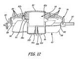 InFIGS. 11A-11D,fan hub96 is a cylinder closed at one end to form the bottom and open at one end to form the top offan hub96.Fan hub96 includespost96aprojecting from the center of the bottom toward the top offan hub96.Post96ais configured to operatively connect toshaft38bofmotor38 as shown inFIG. 12.Blades98 are circumferentially distributed about the periphery offan hub96.Vents100 are distributed in a generally circular pattern about a center of the bottom offan hub96. As shown in the detail view ofFIG. 11D, eachvent100 includeselongated aperture100aarranged radially outward from the center of the bottom offan hub96 and scoop100bprotruding from approximately half of the periphery ofaperture100a.