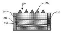 When thecollection member200 is provided for thetoothbrush100, theinlet150 can be incorporated into thefirst layer210. Thesecond layer214 can be provided in a wearable construction and enables gentle removal of microflora and other debris from the tongue and other soft tissue surfaces within the mouth. The tongue, in particular, is prone to develop bacterial coatings that are known to harbor organisms and debris that can contribute to bad breath. This microflora can be found in the recesses between the papillae on most of the tongue's upper surface as well as along other soft tissue surfaces in the mouth. When engaged or otherwise pulled against a tongue surface, for example, tissue cleaning projections orelements217 disposed onsecond layer214 in some embodiments can provide for gentle engagement with the soft tissue while reaching downward into the recesses of adjacent papillae of the tongue. The projections can have a variety of shapes, such as frusto-conically shaped elements, and other shapes that taper to a narrow end and thereby resemble a cone. Alternatively,tissue cleaning elements217 may have other shapes, such as linear ridges. In other possible constructions, theinlet150 can be located within the field of thetooth cleaning elements111.
