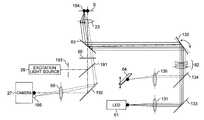 Thedichroic mirror191 may be rotated by installing a mechanism to make thedichroic mirror191 rotatable. If thedichroic mirror191 is rotatable, the optical path of the excitation light can be changed by rotating thedichroic mirror191, so as to move the irradiation position of the excitation light in the visual field of themicroscope11, that is, on theglass cover68, to an arbitrary position. Hence the user can freely move the irradiation position of the excitation light, that is, a position where the fluorescent light is observed, and a position of the image of the reference light, while viewing the image captured by thecamera27 or looking through theoccular28.