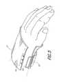 Similarly, thepalmar portion16 and thedorsal portion18 can have aproximal end22 which is contoured82.FIGS. 2 and 3 show theproximal end contour82 lower on theulnar side24 than on theradial side26. That is, theproximal end22 can be closer to thethumb80 than to thepinky finger78. In some embodiments, the proximal end contour is such that theproximal end22 is equally close to thethumb80 andpinky finger78. In some embodiments theproximal contour82 is convex and extends in the longitudinal direction toward the wearer's elbow to provide additional coverage and/or bracing on the wearer's arm. Some embodiments have a concaveproximal contour82 to allow flexion and/or extension of the wrist.