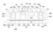 FIG. 1 illustrates a cross-sectional view of aLDMOS transistor structure100 in accordance with one embodiment of the present invention. TheLDMOS transistor structure100 comprises asubstrate101, abarrier layer102, a p-type semiconductor layer103, agate104, asource105, adrain106, a FOX107, aguard ring108 and agate oxide layer109.