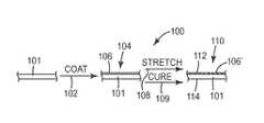 However, it should be understood that the strain induced in theweb101 by theweb stretching process108 can be controlled to at least partially counteract the strain induced by curing thecoating106. That is, it should be understood that the strain induced in theweb101 by theweb stretching process108 can reduce, match or reverse the strain that will be induced by thecuring process109. For example, in some applications, a very slight curl in themulti-layer web110 may be desirable, such that the curl induced by curing thecoating106 needs to be reduced but not cancelled. In some applications, amulti-layer web110 that curls in the direction opposite thecoating106 may be desirable.