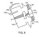 FIG. 9 illustrates the use of a system for restricting flexion in a spinal segment. InFIG. 9, the spinal segment includes asuperior vertebra904, theinferior vertebra908 and the intervertebal disc D.A constraint device910 is applied to the spinous processes SP of the superior andinferior vertebrae904,908. The constraint device restrictsflexion902 of the spinal segment by constraining distraction of the spinous processes SP, thereby increasing or maintainingengagement912 of the facet joint and improving the capacity of the spinal segment to resistshear loading906.