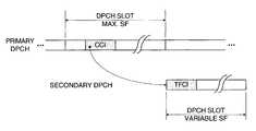 The secondary DPCH frame may include a TFCI for the frame, as shown inFIG. 5. Alternatively, blind format detection could be employed for the secondary channel as well. Knowledge of the spreading factor for the secondary channel, as indicated in the CCI, may reduce the number of hypotheses required for blind format detection.