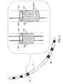FIG. 3 is an exemplary external view of a lead, sayright ventricular lead12, with several satellites, again denoted20a,20b, . . . , disposed therealong. The figure also includes an enlarged detail view of an exemplary electrode configuration for two-wire and one-wire embodiments. The two-wire embodiment is on the left of the detail view, the one-wire embodiment on the right. In this embodiment, the satellites are cylindrical and at least for the two-wire embodiment are provided with four electrodes, again designated100a,100b,100c, and100d, configured in the four quadrants of the cylindrical outer walls ofsatellite20a. The satellite chip is embedded inside the cylinder and is not shown in this figure. Bus conduction paths S1 and S2 pass through the region between the electrodes and are coupled electrically to the S1 and S2 terminals of the satellite chip. The satellite chips in the satellites receive signals over the bus, which in an exemplary embodiment include address information specifying a given satellite and configuration information specifying which, if any, ofelectrodes100a. . .100dare to be coupled to bus conduction paths S1 or S2.