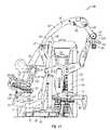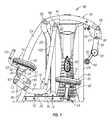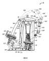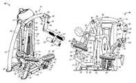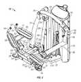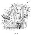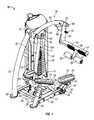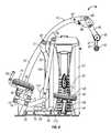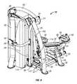 As best illustrated inFIGS. 1,2, and6,main frame12 has a pair offront uprights25,26, parallelbase side struts27,28 extending rearward fromrespective uprights25,26, anupright strut29 extending upward from a location adjacent a rear end of base strut ortube27, and across bar30 extending betweenside struts27,28 and spaced to the rear of thefront uprights25,26. A transversely extending rear base strut orcable guide tube31 extends fromside strut28 and connects to theweight stack housing24 viabracket32, and a cable guide tube or connectingstrut33 extends fromcross bar30 to rear strut orguide tube31. Front upright25 is taller than front upright26 and is pivotally connected toexercise arm84 at its upper end, while theupper torso support14 is pivotally supported on the shorter front upright26, as described in more detail below.Weight stack housing24 is secured to the main frame viabase strut31 and asupport arm34 which extends fromupright strut29 to a rear upright orcable guide tube35 of the housing, as best illustrated inFIG. 6.Bumper pads36 on guide tube33 (seeFIG. 6) and 75 on side strut28 (seeFIG. 8) define a rest position for theexercise arm16 and drivelink100 and for the upper torso support, as described in more detail below. Groundengaging support feet38 are provided at the lower ends of theupright strut28 andfront struts25, and at the rear end ofside strut26.