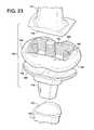 FIG. 23 is an exploded view of the joint implant assembly inFIG. 22 and illustrating a rear adhesive securing surface of a selected male insert portion, and in addition to interconnecting/transitioning stem portions, these connecting at a first end to a rear surface of either male or female implant, the stem portions being interiorly hollowed with open communicating ends configured to seat within the hollow interior of the sectioned bone ends;