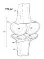 FIG. 22 is a perspective illustration of a full joint implant assembly established between male projecting/extending and female/cup-shaped receiving end secured implants, with the male and female defined ends configured to mimic the normal interaction of surfaces corresponding to such as knee joint;