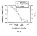 The magneto-elastic-resonance sensor was first interrogated with an empty cavity, then with quarter filled, half filled, and finally with a full cavity. The result is shown graphically inFIG. 4, with the frequency and Q-values being shown for each of the tests. From these tests it can be seen that it is difficult to distinguish between the half-full and full cavity. This is because capillary force pulls the liquid on top of the magneto-elastic-resonance sensor as soon as the liquid reaches the lower tip of the sensor. Note also that the Q-value dropped by 50%, however the change could be significantly higher if a humidity sensitive material was coated on the magneto-elastic-resonance sensor.