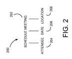 As a simplistic example,FIG. 2 illustrates a template orframe200 in accordance with one example.Frame200 defines an action “schedule meeting” and that is thelabel202 offrame200.Frame200 also includes a plurality of slots. The slots correspond to attributes that further define the action to be taken. In the embodiment shown inFIG. 2, the slots forframe200 include an “attendee”slot204, a “date”slot206 and a “location”slot208.