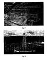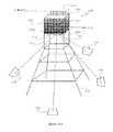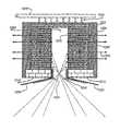 FIG. 22 shows a view of the top of the collector, illustrating the outlet manifold into which the outlet tubes from the heat exchanger open.FIG. 23 shows how two pairs of heat exchanger tubing are arranged on each face of the assembly, and how the heat exchanger tubing fits into tubular holes between two slabs formed from two complementary semicircular cross-section grooves in the two slabs. A corner expansion gap between slabs to allow for thermal expansion in use can also be seen.FIG. 24 shows a view into the cavity from below. Insulation on the shield can be seen.FIG. 25 shows a view of the collector from below. The shield below the collector can be readily seen, as can the insulation provided on the four vertical poles which support the collector. Additionally there is insulation on vertical shafts of at the top of the tower to protect them from stray solar radiation.FIG. 26 shows the plug capable of fitting into the shield aperture when the reflectors are in non-collecting orientations. The plug is mounted on a plug insertion mechanism, in this instance in the form of a scissor lift. Reflectors, in a non-collecting substantially horizontal orientation, may be seen in the background.FIG. 27 shows a stack of slabs of heat regulating medium. This illustrates a suitable shape for the slabs, and shows the grooves in the face of the slab into which heat exchanger tubing will be fitted.FIG. 28 shows a solar collector on top of a tower and surrounded by an as array of reflectors for collecting solar energy and directing it to the collector. This shows the reflectors in a series of concentric circles, and also shows the corridors in the array in which there are no reflectors, so as to avoid directing solar radiation to the poles which support the collector on the tower, thereby reducing the possibility of damage to the poles.
