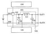 The one of the terminals of thecoil131 is connected to the input terminal IN1 and the other of the terminals of thecoil131 is connected to the anode of thediode130. Thetransistor102 controls connection between the input terminal IN2 or the output terminal OUT2 and a node between thecoil131 and thediode130. Specifically, the first terminal of thetransistor102 is connected to the node between thecoil131 and thediode130, and the second terminal of thetransistor102 is connected to the input terminal IN2 and the output terminal OUT2. The cathode of thediode130 is connected to the output terminal OUT1. The one of the pair of electrodes of thecapacitor132 is connected to the output terminal OUT1 and the other of the electrodes of thecapacitor132 is connected to the output terminal OUT2.