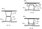 Referring toFIGS. 17a,17b, and17c, detailed views of elements of an embodiment of the four-layer impact reduction system ofFIG. 15 is shown, including thebody conforming layer302, two elastically-resilient impressions in asecond layer304, an elastically-resilient impression in athird layer306, and animpact distribution layer308. In the embodiments shown inFIGS. 17a,17b, and17c, the two layers withdimples304 and306 are in a parallel relationship (i.e. an offset contact) in that an equivalent deflection occurs for thesecond layer304 and third layer and the total compressive force being transmitted is the sum of the force in thesecond layer304 and the force in thethird layer306. In the embodiment shown inFIGS. 17a,17b, and17cthe dimple in thethird layer306 comprises a sealed air chamber and the dimples in thesecond layer304 compriseorifices316 that allow air to bleed out of the dimples, providing a damping feature.FIG. 17ashows the system in a relaxed state in which there is no force compressing theimpact distribution layer308 towards thebody conforming layer302.FIG. 17bshows an exaggerated example what happens as a result of a high speed acceleration of thedistribution layer308 towards the body conforming layer as the bulk of the compression is resisted by the dimples in thesecond layer304 because there is not enough time to bleed the air through theorifices316.FIG. 16cshows an exaggerated exampled of what happens as a result of a low speed acceleration of thedistribution layer308 towards thebody conforming layer302 as the bulk of the compressive force is resisted by the sealed dimple of thethird layer306 because there is time to bleed the air through theorifices316 of the dimples in thesecond layer304.
