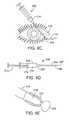 Experiment 9Evaluation of Inserts Shaped In SituFIG. 25 shows in situ deformation and curvature of an insert subsequent to placement in an eye with the insert curved so as to correspond to at least the curvature of the lid along the cul-de-sac. The insert was initially flat and comprised a polypropylenesuture retention structure110 andsilicone support structure120. The insert was oriented as shown and such that the upper silicone portion was placed over the lacrimal gland toward the superior temporal portion of the eye. The model eye is shown to indicate alignment of the insert to the eye and the corresponding in situ formed curvature of the insert to the eye.