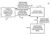 Compared to other known systems, the above process can result in a faster auto focus process since a maximum of only 7 or 8 frames (one at each nonuniform lens position) need be captured or evaluated as opposed to, for example, a maximum of 11 which may be typical for an auto focus system that uses uniform lens positions, such as every 25 steps. This can also result in less power consumption since fewer frames are captured and analyzed as part of the auto focus process. Other advantages will be recognized by those of ordinary skill in the art.