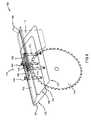 With specific reference toFIG. 4, thesecond locking mechanism26 is attached toward a backside of themounting member22 and includes a quick release mechanism. The quick release mechanism includes ablock38 and alever40 operably attached to apivot pin42. Theblock38 includes a v-shaped recess38aformed in an underside thereof for engaging a v-shaped edge10aon the rivingknife10. Thelever40 is operable between an open position and a closed position (shown in phantom inFIG. 4). Thelever40 includes atop end40aand abottom end40bhaving alock pin44 extending from an inner side thereof for selectively engaging theaperture16 in theriving knife10. Thelock pin44 extends from thelever40 at a slight angle upward relative an axis A, such that when thelock pin44 enters theaperture16, it engages a top surface of theaperture16 and biases the hood assembly onto the rivingknife10. The mechanism further includes acoil spring46 disposed between theblock38 and theupper end40aof thelever40 for biasing thelever40 in the closed position. In another embodiment, the second quick release mechanism includes a spring biased lock member adapted to engage the rivingknife10 as described below in reference toFIG. 9.