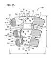 FIG. 14 is a front elevation of another embodiment of a compression sleeve with an outer cover partially removed to show intermediate layers and an inner layer;