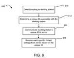 As discussed above, in certain embodiments, default settings associated with a particular monitoring location such as a hospital ward may be acquired through a docking station and/or network. For example,FIG. 6 is a flowchart of aprocess600 for updating the configuration settings of a patient monitor from a network server according to one embodiment. Theprocess600 includes detecting610 a coupling of a patient monitor to a docking station and determining612 a unique identifier (ID) associated with the docking station. The unique ID may be stored in the docking station's memory and/or may be a MAC address. Theprocess600 further includes communicating614 the docking station's unique ID to the network server and receiving616 ward-specific default settings from the server based on the unique ID. Certain embodiments of theprocess600 may also include determining whether the settings of a particular docking station should be updated and/or querying the user to determine which if any of the ward-specific default settings to load.