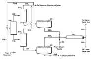 The embodiment illustrated inFIG. 3 best suits an SDRP in which the wells' produced fluids are of similar quality, and where wells may comprise a fluid with two liquid phases. However, in cases where a subset of the wells are producing a fluid substantially different in quality from another subset of wells, it may be advantageous to not mix the produced fluid of all of the wells prior to feeding into a liquid-liquid separation vessel (306). Field observations of the quality of the produced oil in SDRPs show that the quality of the produced fluid may vary with time. For example, in a cyclic SDRP, the quality of the oil produced shortly after injection ceases and production begins may be higher than the quality of the oil produced towards the end of the production cycle. A well may produce only a light liquid phase for a time, then both a light and heavy phase for a time, and finally only a single heavy phase. In such a case, the produced fluids may be introduced directly into the process vessels (312,314) appropriate for their quality. In practice, a densitometer may be installed in the field to measure the density of the produced fluid, and the fluid routed to the appropriate process vessel (306,312,314) depending on the density (medium, light, or heavy).