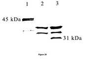 FIG. 28. Western blot with 9E10 MAb to C-terminal c-myc epitope of the single chain Fv (ScFv) antibody. (Lane 1): Fusion protein (45 kDa) of streptavidin (SA) and OX26 ScFv, used as a positive control. This OX26 ScFv-SA fusion protein is comprised of 3 domains: OX26 ScFv, SA, and c-myc C-terminal epitope, and was affinity purified from bacterial pellets. (Lane 2): Negative control: media conditioned by COS cells transfected with Lipofectamine and no plasmid DNA. The9E 10 anti-c-myc MAb cross-reacts with 2 proteins of 35-37 kDa that are secreted by COS cells. Note the absence of the 29 kDa anti-Aβ ScFv in the media of COS cells not transfected with pCD-mAβScFv. (Lane 3): Anti-AβScFv obtained from media conditioned by COS cells transfected withLipofectamine 2000 and pCD mAβScFv (FIG. 1B); the anti-Aβ ScFv has a molecular weight of 29 kDa, and is 16 kDa smaller in size than the OX26 ScFv-SA fusion protein inlane 1, owing to the presence of the 16 kDa SA moiety in the OX26 ScFv/SA fusion protein.