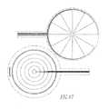 FIG. 47 shows a layout of circular UnMousePad showing both radial and concentric circle electrodes on top and bottom sensor layers.