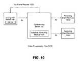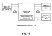 FIG. 11 illustrates a second logical diagram for an adaptive scheduling technique to use video scalability to improve latency inmultimedia conference system100. As shown inFIG. 11, shortly afteradaptive scheduling module1004 transmits the lower video layers,adaptive scheduling module1004 progressively transmits more enhancement layers to provide a higher frame rate and/or higher resolution.FIG. 11 illustrates the case where the two temporal scales are transmitted to improve motion rendition in the video information.