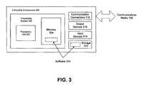 FIG. 3 illustrates a block diagram ofcomputing environment300.Computing environment300 may be implemented as a device, or part of a device, such asconferencing server102 and/or client terminals106-1-m. In some embodiments,computing environment300 may be implemented to executesoftware310. Examples ofsoftware310 may includescalable video encoder104 and/or visual composition modules110-1-p. For example, when computingenvironment300 is implemented as part ofconferencing server102,software programs310 may includescalable video encoder104 and/or visual composition modules110-1-pand accompanying data. In another example, when computingenvironment300 is implemented as part of a client terminal106-1-m,software programs310 may includescalable video encoder104 and/or visual composition modules110-1-pand accompanying data. In yet another example, when computingenvironment300 is implemented as part ofconferencing server102 and/or client terminal106-1-m,software programs310 may include an operating system or other system software typically implemented for an electrical, electronic, and/or electro-mechanical device. Although some embodiments may be described with operations forscalable video encoder104 and/or visual composition modules110-1-pimplemented as software stored and executed by computingenvironment300, it may be appreciated that the operations forsoftware modules104,110 may be implemented using dedicated hardware, software or any combination thereof. The embodiments are not limited in this context.