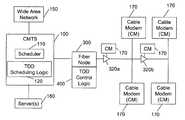 In many cable systems implementing DOCSIS, the spectrum used by cable system service providers has generally included, in the United States, 50-870 MHz forward or downstream band and a 5-42 MHz reverse or upstream band. The frequency separated downstream band is used by the CMTS100 to deliver the services requested by customers, whereas the frequency separated upstream band is used by therespective CMs170 to communicate with the CMTS100 (as well as entities with which the CMTS100 can communicate via the Wide Area Network150). In light of the large number of fielded CMs170 (perhaps thousands or even tens of thousands) supported by asingle CMTS100 via, e.g., multiple Fiber Nodes300, a CMTS100 operates in conjunction with Scheduler110 to notify theCMs170 as to when they can respectively communicate upstream in an allocated predefined time slot, in, e.g., a time division multiple access (TDMA) manner.
