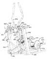DETAILED DESCRIPTION OF PREFERRED EMBODIMENTSThe present invention provides elliptical motion exercise machines or apparatus which link rotation of left and right cranks to generally elliptical motion of respective left and right foot supports. The term “elliptical motion” is intended in a broad sense to describe a closed path of motion having a relatively longer major axis and a relatively shorter minor axis. In general, the present invention may be said to use displacement of the cranks to move the foot supports in a direction coincidental with one axis of the elliptical path, and displacement of crank driven members to move the foot supports in a direction coincidental with the other axis. A general characteristic of the present invention is that the crank diameter determines the length of one axis, but does not determine the length of the other axis. As a result of this feature, a person's feet may pass through a space between the cranks while nonetheless traveling through a generally elliptical path having a desirable aspect ratio, and the machines that embody this technology may be made relatively more compact, as well. The embodiments shown and/or described herein are generally symmetrical about a vertical plane extending lengthwise through a floor-engaging base (perpendicular to the transverse ends thereof). In general, the “right-hand” components are one hundred and eighty degrees out of phase relative to the “left-hand” components. However, like reference numerals are used to designate both the “right-hand” and “left-hand” parts, and when reference is made to one or more parts on only one side of an apparatus, it is to be understood that corresponding part(s) are disposed on the opposite side of the apparatus. Also, to the extent that reference is made to forward or rearward portions of an apparatus, it is to be understood that a person can typically exercise on such apparatus while facing in either direction relative to the linkage assembly.
