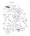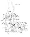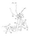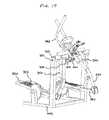 Referring now toFIG. 17, anactuator382 may be mounted to an actuator frame385 that extends between thestanchions398 of theapparatus frame399 and is fixedly secured thereto. A user interface screen orconsole397 may be supported on spaced apartparallel rails386 of the actuator frame385. Acarriage383 may be connected to arod end384 of theactuator382 and movably supported on the actuator frame385. In order to provide adjustability of the foot path, arod end384 of theactuator382 is connected to thecarriage383. Thecarriage383 is constrained to travel parallel to therails386 of the actuator frame385, asrollers381 engage and roll therewith. Activation of theactuator382 extends or retracts therod end384 of theactuator382, thereby moving thecarriage383 along therails386. A second end of thecontrol link392 is rotatably connected to thecarriage383 at atransverse shaft395 of thecarriage383. The control link392 moves with thecarriage383 and therefore movesshaft365 relatively closer or further away from shaft367 (more clearly shown inFIGS. 12 and 15) while adjusting the foot path. As indicated earlier herein, theactuator382 may be a motor which adjusts the relative position ofshaft365, or alternatively may be some type of spring, damper, and/or some combination of spring-damper, or other mechanism which allows the user to in one instance manually adjust the stride length, or have the stride length vary as a function of user applied force. In the former instance, a computer program may effect a change in the stride length as part of an interactive program, or during the course of responding to signals from strain gauges and the like which may be incorporated into the machine for purposes of variable and responsive foot path changes. It is understood that the signal(s) may be monitored at other electrical components of the machine, for example, at an electronic brake as an input signal which may cause the foot stride length to be varied.