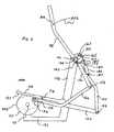 Referring now toFIGS. 25-30, a fourth embodiment of the present invention generally identified by the reference numeral400 is shown. Aframe499 rotatably supports acrank disk410 at acrank axle415. Ahandle bar rocker440 is rotatably connected to afront stanchion498 of theframe499 atshaft441. Ahandle bar442 is rigidly connected to thehandle bar rocker440. Ahandle bar lobe444, rigidly connected to thehandle bar440, more clearly shown inFIG. 30, is provided for spatial purposes as will be evident in other illustrations shown and described herein. A lower distal end of thehandle bar rocker440 is rotatably connected to a forward distal end of alongitudinal foot member420 atshaft443. Afoot platform422 is rigidly connected to thefoot member420. Acrank roller436 is rotatably secured to a crankshaft433, and supports thefoot member420. Thecrank roller436 is generally in rolling contact with a race421 of thefoot member420.