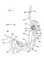 Referring first toFIGS. 1-4, a first embodiment of the present invention is generally identified by thereference numeral100. Referring particularly toFIG. 1, aframe199 rotatably supports acrank disk110 atcrank axle115. Ahandle bar rocker140 is rotatably connected to afront stanchion198 of theframe199 atshaft141. Ahandle bar142 is rigidly connected to thehandle bar rocker140. A lower distal end of thehandle bar rocker140 is rotatably connected to a forward distal end of alongitudinal foot member120 atshaft143. Afoot platform122 is rigidly connected to thefoot member120. Acrank roller136 is rotatably secured to a crankshaft133 and supports thefoot member120 thereon. Thecrank roller136 is generally in rolling contact with arace121 of thefoot member120.