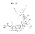 Directing attention now toFIGS. 12-24, a third embodiment of the present invention generally identified by the reference numeral300 is shown. It will be observed thatFIGS. 12-15 show only one side of the exercise apparatus300 for clarity of illustration. Aframe399 rotatably supports acrank disk310 atcrank axle315. Ahandle bar rocker340 is rotatably connected to afront stanchion398 of theframe399 atshaft341. Ahandle bar342 is rigidly connected to thehandle bar rocker340. A lower distal end of thehandle bar rocker340 is rotatably connected to a forward distal end oflongitudinal foot member320 atshaft343. Afoot platform322 is rigidly connected to thefoot member320. Acrank roller336 is rotatably secured to a crankshaft333, and supports thefoot member320. Thecrank roller336 is generally in rolling contact with arace321 of thefoot member race320.