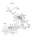 Referring now toFIG. 3, theactuator rod184 is shown fully retracted which consequently moves the axis ofshaft165 furthest away from the axis ofshaft167, as best shown inFIG. 4c, thereby establishing a maximum foot path FP3 and a maximum arm path AP3.