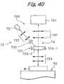 FIG. 40 schematically shows a typical optical system and a detector of a charged particles beam apparatus of an embodiment according to the present invention. Though the optical system is provided in thelens body71, these optical system and detector are illustrated only as an example, but the other optical systems and detectors may be employed if required. Anoptical system760 of the charged particles beam apparatus comprises a primaryoptical system72 for irradiating a charged particles beam against a sample W loaded on astage50 and a secondaryoptical system74 into which secondary electrons emanated from the sample are to be introduced. The primaryoptical system72 comprises anelectron gun721 for emitting the electron, a lens systems composed of two stages ofelectrostatic lenses722 for converging the electron emitted from theelectron gun721, adeflector730, a Wien filter or an E.times.B separator723 for deflecting the charged particles beam so as for an optical axis thereof to be directed to perpendicular to a surface of an object, and a lens system composed of two stages ofelectrostatic lenses724, wherein those components of the primaryoptical system72 are arranged in the order with theelectron gun721 at the topmost location so that the optical axis of the charged particles beam is inclined to the line normal to a surface of the sample W (a sample surface) as shown inFIG. 40. The E.times.B deflecting system723 comprises an electrode723-1 and a magnet723-2.
