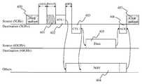 According to a variant, theRTS1 request402 contains information representative of an authorization request to send data over the first physical channel and over the second physical channel. TheCTS1 agreement403 sent over the first physical channel advantageously contains an agreement to transmit over the first physical channel and over the second physical channel, in response to theRTS1 request402. Some of thedata405, namely at least one data packet, is then transmitted over the second physical channel and the other part is transmitted over the first physical channel. The data transmitted over the first physical channel advantageously has a higher level of priority than that transmitted over the second physical channel. According to a variant, theframe ACK406 contains information relative to the acknowledgement of the data received on the first physical channel and information relative to the acknowledgement of the data received on the second physical channel. According to another variant, theframe ACK406 contains information representative of the non-reception or of a partial reception of the data transmitted over the first physical channel and/or information representative of the non-reception or of a partial reception of the data transmitted over the first physical channel in case of poor reception of data on respectively the first channel and/or the second channel.