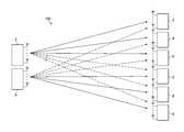 Referring now toFIG. 1, there is shown a schematic diagram depiction of acommunication system100 in which there is downlink multi-user interference alignment implemented for signal transmissions fromtransmitters2,6 to receivers3-5,7-9 in accordance with selected embodiments of the present disclosure. In the depicted embodiment, each of the transmitters TX1and TX2(e.g., eNBs) is equipped with M antennas and configured to transmit signals to receivers (e.g., UEs) which are each equipped with K antennas. The area covered by transmitter TXiis referred to as cell i and the jth UE in cell i is referred to as UE (i,j) where there are as many as LiUEs may be served by the transmitter TXi. Eachtransmitter TXi2,6 denotes a data transmission device such as a fixed base station, a mobile base station, Macro eNB, Relay Node, Micro eNB, a miniature or femto base station, a relay station, and the like. Each of the receiver nodes3-5,7-9 denotes a data reception device such as a relay station, a fixed terminal, a mobile terminal, user equipment and the like.