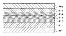 FIG. 1 shows a light emitting element having a light emitting layer113 between afirst electrode101 and asecond electrode102. In the light emitting element shown inFIG. 1, amixed layer111 is provided between the light emitting layer113 and thefirst electrode101. Ahole transporting layer112 is provided between the light emitting layer113 and themixed layer111. An electron transporting layer114 and anelectron injecting layer115 are provided between the light emitting layer113 and thesecond electrode102. In this light emitting element, when voltage is applied to both thefirst electrode101 and thesecond electrode102 so that potential of thefirst electrode101 is higher than that of thesecond electrode102, holes are injected to the light emitting layer113 from the side of thefirst electrode101 whereas electrons are injected to the light emitting layer113 from the side of thesecond electrode102. Then, the holes and electrons injected to the light emitting layer113 are recombined. The light emitting layer113 contains a light emitting substance. The light emitting substance is excited by excitation energy generated by recombination of the holes and electrons. The light emitting substance in an excited state emits light upon returning to a ground state.