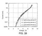 FIG. 37 shows measurement results of the voltage-current characteristics. InFIG. 37, a horizontal axis represents voltage (V) whereas a vertical axis represents current (mA).